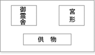 神棚と御霊舎を同じ場所におまつりする場合は、宮形と御霊舎の座位を考えて、下図のように宮形と御霊舎を並べてすえます。